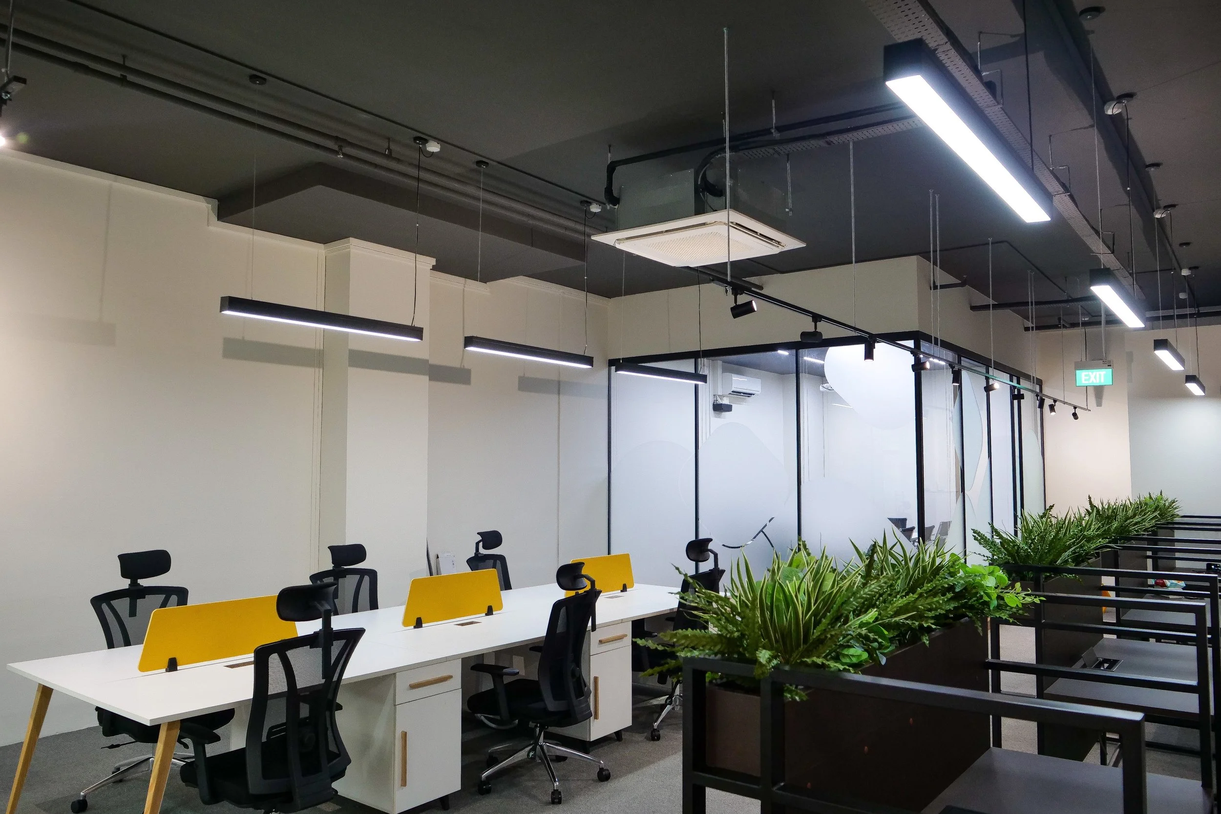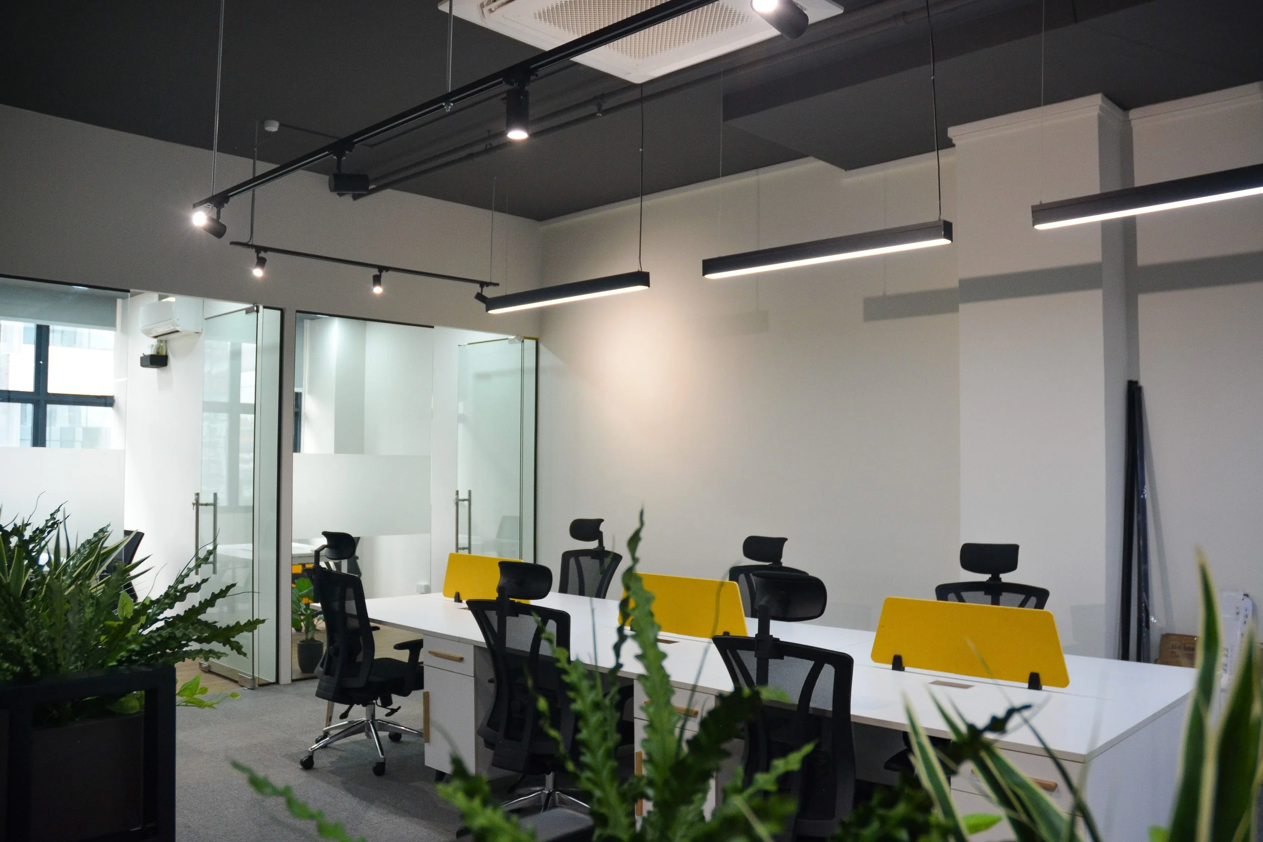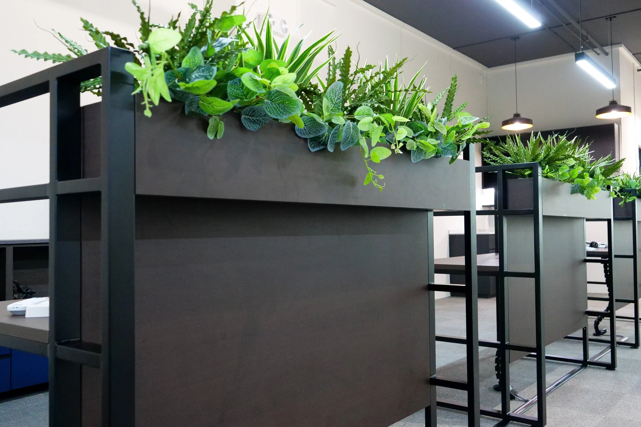 Amidst the open workspace, we exclusively custom-designed individual work desks with integrated planters that act as a natural barrier, fostering a sense of personal space without feeling confined.