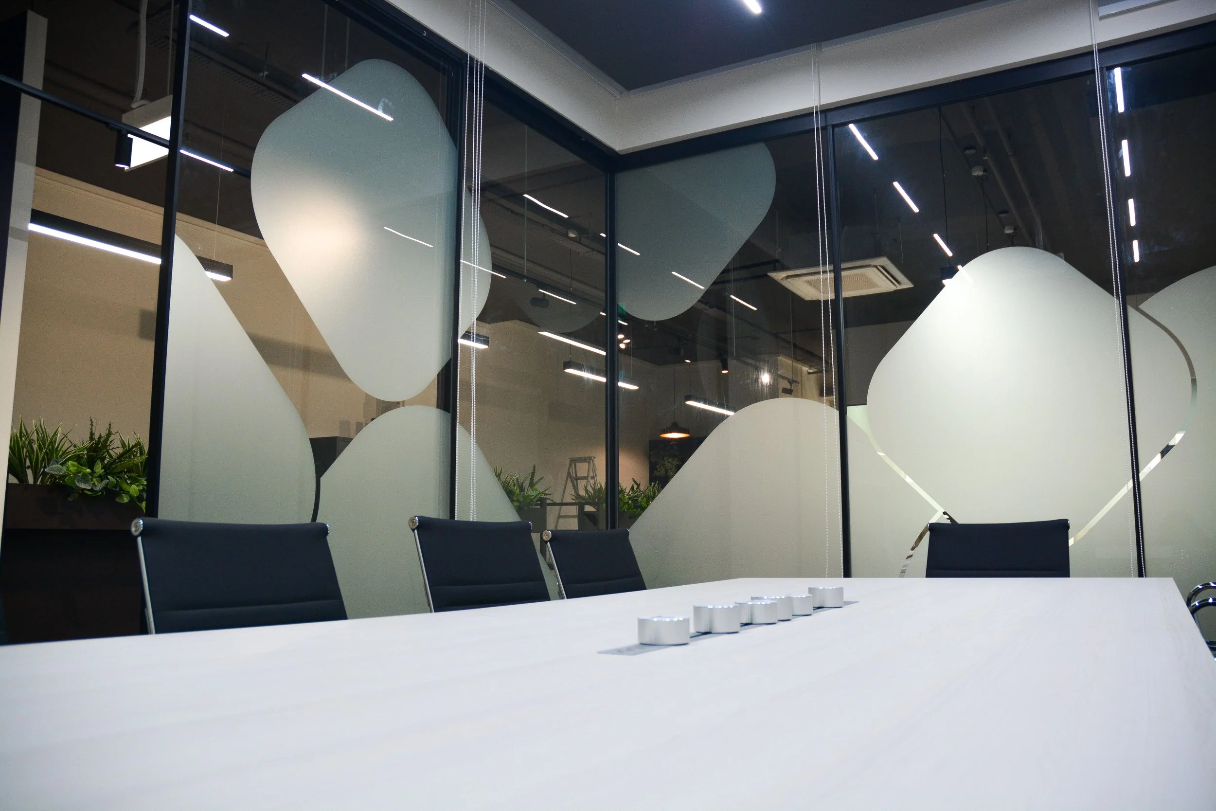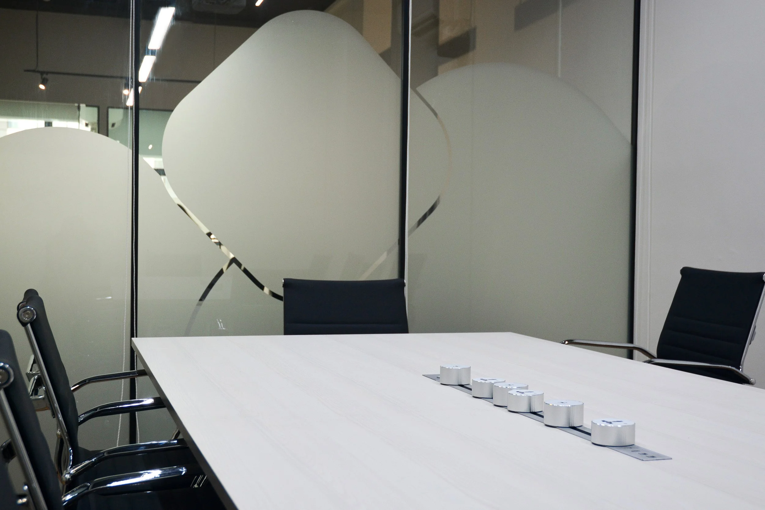 The conference room takes on a glass box design, donned with artful frosting decals that both conceals and reveals, offering privacy while inviting a sense of openness.